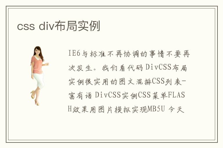 IE6與標準不再協調的事情不要再次發(fā)生。我們看代碼 DivCSS布局實例很實用的圖文混排CSS列表-富有語 DivCSS實例CSS菜單FLASH效果用圖片模擬實現MB5U 今天有人