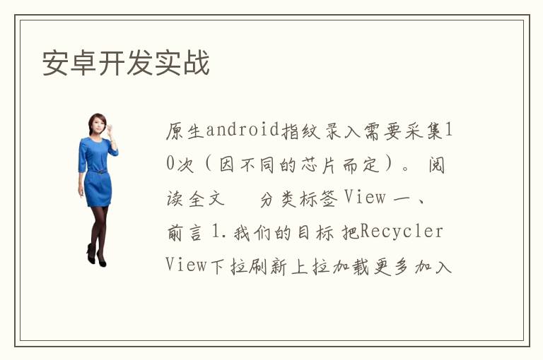 原生android指紋錄入需要采集10次(因不同的芯片而定)。 閱讀全文 ? 分類標簽 View 一 、前言 1.我們的目標 把RecyclerView下拉刷新上拉加載更多加入到我們的開發(fā)者頭條