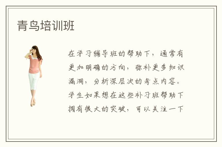 在學(xué)習(xí)輔導(dǎo)班的幫助下,通常有更加明確的方向,彌補(bǔ)更多知識(shí)漏洞,分析深層次的考點(diǎn)內(nèi)容。學(xué)生如果想在這些補(bǔ)習(xí)班幫助下?lián)碛泻艽蟮耐黄疲梢躁P(guān)注一下青鳥(niǎo)培訓(xùn)班專(zhuān)業(yè)課程以及教學(xué)方案、培訓(xùn)設(shè)施、學(xué)習(xí)成果等等。部分補(bǔ)習(xí)班的資源確實(shí)不夠多,配套設(shè)施不夠齊備,學(xué)生的應(yīng)用水準(zhǔn)不夠高,往往會(huì)對(duì)這些機(jī)構(gòu)不滿(mǎn),甚至給出負(fù)面的評(píng)價(jià),學(xué)生要謹(jǐn)慎關(guān)注。青鳥(niǎo)培訓(xùn)班多少費(fèi)用,可能在2000~6000,但事實(shí)上學(xué)生的報(bào)名課程難度不同,時(shí)間等等會(huì)變化,所以預(yù)算有差別。青鳥(niǎo)培訓(xùn)班補(bǔ)習(xí)形式相當(dāng)多樣,比如如今大家很喜歡的網(wǎng)絡(luò)培訓(xùn)方案,大家通過(guò)互聯(lián)網(wǎng)的方式,在家里利用手機(jī)或iPad、電腦等等即可上課,而且學(xué)習(xí)時(shí)間比較短,但老師講課的內(nèi)容相當(dāng)全面,基本不存在培訓(xùn)漏洞。