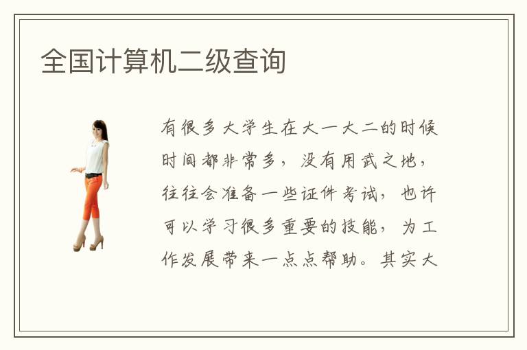 有很多大學(xué)生在大一大二的時(shí)候時(shí)間都非常多,沒有用武之地,往往會(huì)準(zhǔn)備一些證件考試,也許可以學(xué)習(xí)很多重要的技能,為工作發(fā)展帶來一點(diǎn)點(diǎn)幫助。其實(shí)大家要考取相關(guān)證件,可關(guān)注一下計(jì)算機(jī)二級(jí)考試,這些考試比較基礎(chǔ),不管是本專業(yè)學(xué)生,還是非本專業(yè)學(xué)生,都可以學(xué)習(xí)很多基礎(chǔ)的計(jì)算機(jī)應(yīng)用知識(shí),至少在以后的軟件辦公或者程序編程方面沒有太多問題。全國(guó)計(jì)算機(jī)二級(jí)計(jì)算機(jī)二級(jí)查詢時(shí)間是5月份和11月份,主要是看每個(gè)省份的公布時(shí)間,在成績(jī)公布之后,同學(xué)可以搜索考試教育網(wǎng)站,然后填寫考試號(hào)或者身份證號(hào),便可知道自己的考試結(jié)果。全國(guó)計(jì)算機(jī)二級(jí)有沒有用,很多考試都是有用的,計(jì)算機(jī)二級(jí)考試也是如此。計(jì)算機(jī)二級(jí)報(bào)考的時(shí)間是在12月份,但同學(xué)要時(shí)刻關(guān)注當(dāng)年的考試報(bào)名時(shí)間。
