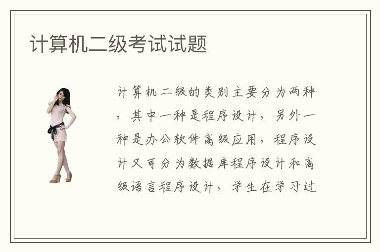 計算機二級的類別主要分為兩種,其中一種是程序設計,另外一種是辦公軟件高級應用,程序設計又可分為數(shù)據(jù)庫程序設計和高級語言程序設計,學生在學習過程當中,可以多花心思去準備,了解自己在工作時需要應用到的知識。計算機二級考試怎么備考,同學在備考階段,不妨結合往年的計算機二級考試試題,進行嚴格的訓練,另外可利用視頻案例講解以及應用課程講解等等方式,提高自己的能力。不少同學并沒有學習的經驗和基礎,計算機應用能力非常糟糕,可以報名專業(yè)的計算機輔導機構。計算機二級的考試時間一般是一年分為4次,3月,6月,9月,12月。就是大家在選擇考試報名的時候,可以先搜索一下考試網站的信息,了解每個省份的報名時間和考試時間,做好自己的決定。