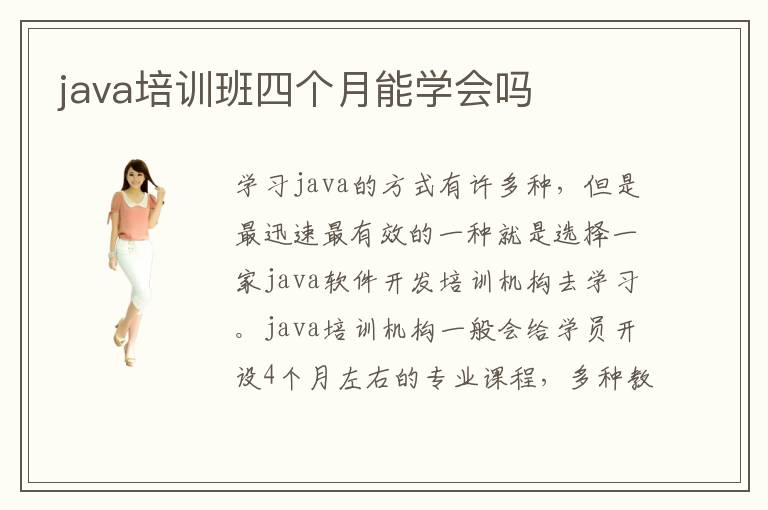 學習java的方式有許多種,但是最迅速最有效的一種就是選擇一家java軟件開發(fā)培訓機構(gòu)去學習。java培訓機構(gòu)一般會給學員開設(shè)4個月左右的專業(yè)課程,多種教學方案,因材施教。四個月的時間說長不長,說短也不短,那么究竟java培訓班四個月能學會嗎?不同的java培訓機構(gòu)會造成不同的學習效果,選擇的時候需要大家謹慎一些,從多方面考察學校。