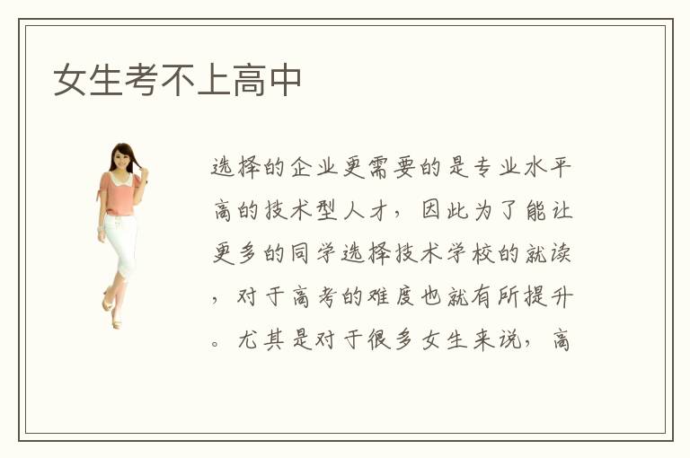 選擇的企業(yè)更需要的是專業(yè)水平高的技術(shù)型人才,因此為了能讓更多的同學(xué)選擇技術(shù)學(xué)校的就讀,對(duì)于高考的難度也就有所提升。尤其是對(duì)于很多女生來(lái)說(shuō),高中的知識(shí)更適合一些理性思維能力較好的同學(xué),這方面女生相對(duì)于男生來(lái)說(shuō)一般是比較遜色的。女生考不上高中就可以去專業(yè)的技術(shù)培訓(xùn)學(xué)校選擇一些適合女生學(xué)習(xí)的專業(yè),例如計(jì)算機(jī)專業(yè)中的UI設(shè)計(jì)進(jìn)行學(xué)習(xí)。