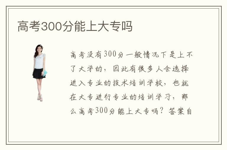 高考沒有300分一般情況下是上不了大學(xué)的,因此有很多人會(huì)選擇進(jìn)入專業(yè)的技術(shù)培訓(xùn)學(xué)校,也就在大專進(jìn)行專業(yè)的培訓(xùn)學(xué)習(xí),那么高考300分能上大專嗎?答案自然是肯定的,大專對(duì)于學(xué)員們的成績(jī)要求并不是很高,可以說(shuō)是特別為這些考不上大學(xué)的同學(xué)打造的專業(yè)技術(shù)培訓(xùn)基地。大專的課程培訓(xùn)專業(yè)性還是比較強(qiáng)的,也是比較適合沒有順利考上大學(xué)的同學(xué)進(jìn)行專業(yè)課程學(xué)習(xí)的。