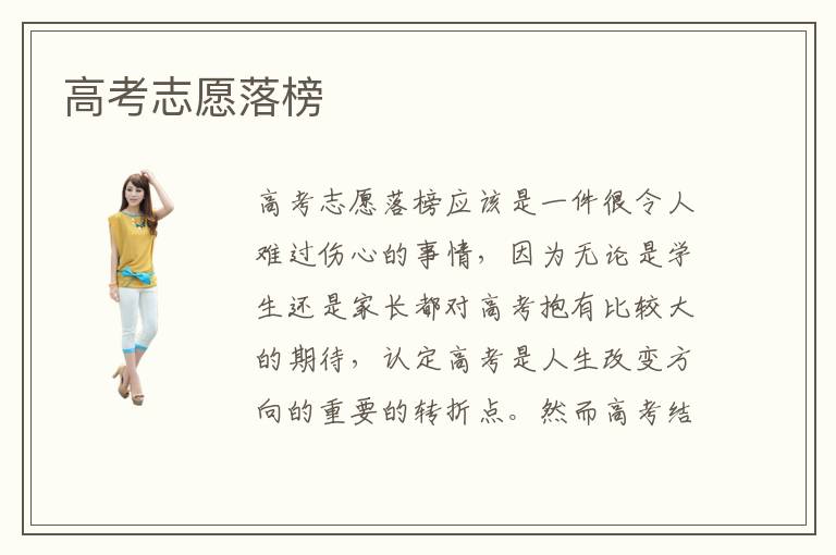 高考志愿落榜應(yīng)該是一件很令人難過傷心的事情,因?yàn)闊o論是學(xué)生還是家長都對高考抱有比較大的期待,認(rèn)定高考是人生改變方向的重要的轉(zhuǎn)折點(diǎn)。然而高考結(jié)束后又有另外一件非常重要的事就是填寫高考志愿。高考志愿填得失誤是大家不愿意面對的事情,因?yàn)楦呖贾驹肝茨茕浫〉蒙弦彩沟米约簡适Я艘粋€(gè)進(jìn)入到滿意的大學(xué)學(xué)習(xí)的良好機(jī)會。高考落榜很難過。