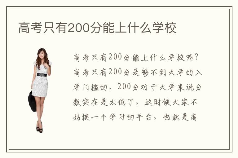 高考只有200分能上什么學(xué)校呢?高考只有200分是夠不到大學(xué)的入學(xué)門(mén)檻的,200分對(duì)于大學(xué)來(lái)說(shuō)分?jǐn)?shù)實(shí)在是太低了,這時(shí)候大家不妨換一個(gè)學(xué)習(xí)的平臺(tái),也就是高考只有200分的同學(xué)可以選擇一些專業(yè)技術(shù)大專學(xué)校進(jìn)行學(xué)習(xí),只要選好一門(mén)具有廣闊發(fā)展前景的專業(yè)技術(shù),再加上大專技術(shù)學(xué)院的專業(yè)化教學(xué)以及自身的努力,還是可以憑借這條道路為自己贏得更美好的未來(lái)。