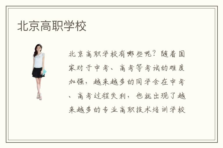 北京高職學(xué)校有哪些呢?隨著國家對于中考、高考等考試的難度加強,越來越多的同學(xué)會在中考、高考過程失利,也就出現(xiàn)了越來越多的專業(yè)高職技術(shù)培訓(xùn)學(xué)校。高職技術(shù)培訓(xùn)學(xué)校這兩年已經(jīng)成為了同學(xué)們進行專業(yè)課程學(xué)習(xí)的首選平臺,而北京又是作為我國經(jīng)濟開發(fā)建設(shè)的一線大城市,因此關(guān)于“北京高職學(xué)校”的數(shù)量都是數(shù)不清的,但是在選擇的時候還要根據(jù)同學(xué)們的自身情況選擇合適的。