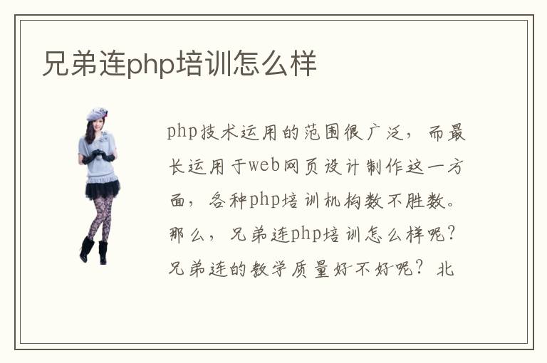php技術(shù)運(yùn)用的范圍很廣泛,而最長(zhǎng)運(yùn)用于web網(wǎng)頁(yè)設(shè)計(jì)制作這一方面,各種php培訓(xùn)機(jī)構(gòu)數(shù)不勝數(shù)。那么,兄弟連php培訓(xùn)怎么樣呢?兄弟連的教學(xué)質(zhì)量好不好呢?北京兄弟連互聯(lián)網(wǎng)培訓(xùn)學(xué)校是一家具有實(shí)力的it培訓(xùn)機(jī)構(gòu),擁有最權(quán)威的教學(xué)團(tuán)隊(duì),豐富的校園生活,以小組為一個(gè)整體參加各種項(xiàng)目的設(shè)計(jì)制作,在潛移默化中讓學(xué)生感受到團(tuán)隊(duì)合作的重要性,打造全方面發(fā)展的高端php人才。
