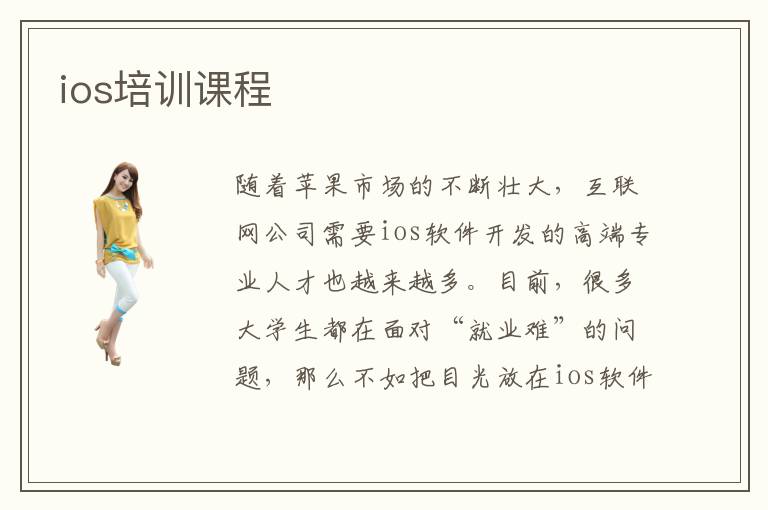 隨著蘋果市場(chǎng)的不斷壯大,互聯(lián)網(wǎng)公司需要ios軟件開發(fā)的高端專業(yè)人才也越來越多。目前,很多大學(xué)生都在面對(duì)“就業(yè)難”的問題,那么不如把目光放在ios軟件開發(fā)上,各大企業(yè)對(duì)于這一方面的人才都很緊缺。學(xué)習(xí)ios就要選擇一家權(quán)威的ios培訓(xùn)機(jī)構(gòu)去學(xué)習(xí),那么,ios培訓(xùn)課程會(huì)開設(shè)哪些課程呢?一般都會(huì)從基礎(chǔ)課程開始學(xué)習(xí),循序漸進(jìn),才能把技能學(xué)的扎實(shí)。