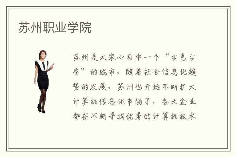 蘇州職業(yè)學院是一所以專業(yè)技術(shù)培訓為主的學校,已經(jīng)根據(jù)不同的專業(yè)課程未來的就業(yè)需求,進行了合理的課程開設(shè)。其實蘇州職業(yè)學院的發(fā)展是沒有這么順利的,蘇州職業(yè)學院的成立初期,是遭到了廣大市民否定的,認為在蘇州職業(yè)學院進行專業(yè)學習是浪費時間的表現(xiàn),都認為蘇州職業(yè)學院的專業(yè)教學水平差,其實蘇州職業(yè)學院只是把更多的精力放在了專業(yè)課程的研究上,并沒有過多的去注重對于蘇州職業(yè)學院的宣傳。