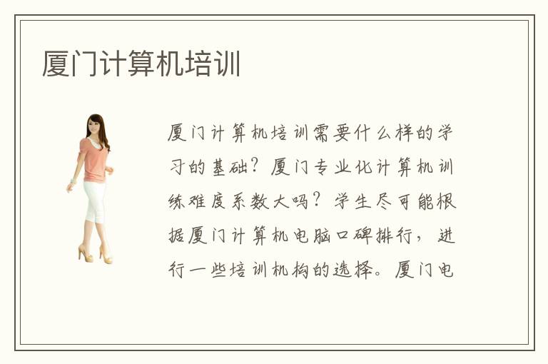 廈門計算機培訓排名具有比較高的科學參考價值,在基礎地接觸過計算機后,我們?nèi)绻胍钊氲亓私釯T行業(yè)的相關專業(yè)技術,不妨選擇一些口碑比較好的廈門電腦培訓機構去接受培訓。廈門計算機專業(yè)培訓項目內(nèi)容豐富,為了更加強化學生的計算機學習情況,學校特別爭取到與周邊企業(yè)的合作關系,在投資資金允許的情況下,開展不少的校企合作項目,鍛煉學生。