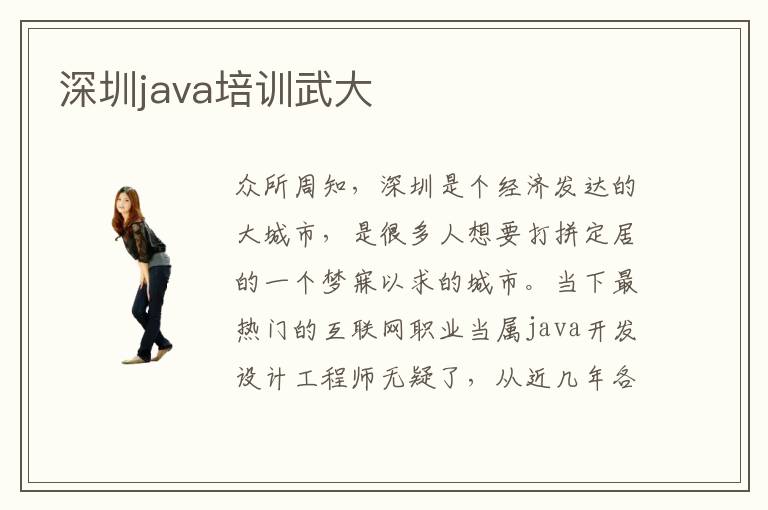 眾所周知,深圳是個(gè)經(jīng)濟(jì)發(fā)達(dá)的大城市,是很多人想要打拼定居的一個(gè)夢(mèng)寐以求的城市。當(dāng)下最熱門(mén)的互聯(lián)網(wǎng)職業(yè)當(dāng)屬java開(kāi)發(fā)設(shè)計(jì)工程師無(wú)疑了,從近幾年各大企業(yè)對(duì)于java相關(guān)人才的需求量數(shù)據(jù)就不難看出。而企業(yè)看中的自然是你的技術(shù)能力,能力越強(qiáng)、技術(shù)越好,所受到的薪資待遇就越好,我想這一定是成正比的,深圳java培訓(xùn)武大出版的java相關(guān)書(shū)籍資料就很適合大家學(xué)習(xí)。