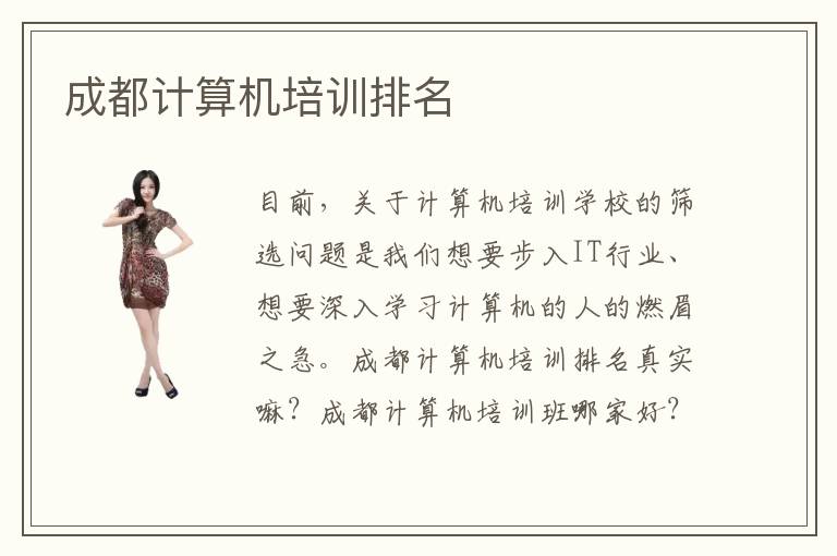 目前,關(guān)于計(jì)算機(jī)培訓(xùn)學(xué)校的篩選問(wèn)題是我們想要步入IT行業(yè)、想要深入學(xué)習(xí)計(jì)算機(jī)的人的燃眉之急。成都計(jì)算機(jī)培訓(xùn)計(jì)算機(jī)培訓(xùn)排名真實(shí)嘛?成都計(jì)算機(jī)培訓(xùn)班哪家好?怎樣高效挑選成都電腦培訓(xùn)機(jī)構(gòu)?成都計(jì)算機(jī)電腦培訓(xùn)中心在教學(xué)側(cè)重點(diǎn)上每一家都有不同,想要保證自己學(xué)習(xí)是高效的有效的,我們就得抓緊時(shí)間考察一番。成都計(jì)算機(jī)培訓(xùn)是專(zhuān)業(yè)教師負(fù)責(zé)的計(jì)算機(jī)培訓(xùn)項(xiàng)目教學(xué)。