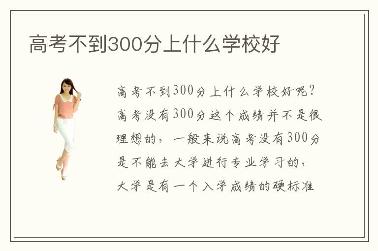 高考不到300分上什么學(xué)校好呢?高考沒有300分這個(gè)成績并不是很理想的,一般來說高考沒有300分是不能去大學(xué)進(jìn)行專業(yè)學(xué)習(xí)的,大學(xué)是有一個(gè)入學(xué)成績的硬標(biāo)準(zhǔn)的,因此高考不到300分也就不能上大學(xué)了。那么,高考不到300分上什么學(xué)校好呢?現(xiàn)在有很多大專技術(shù)培訓(xùn)學(xué)校成立起來,這些大專技術(shù)培訓(xùn)學(xué)校通常是高考落榜學(xué)生們進(jìn)行專業(yè)學(xué)習(xí)的平臺,因此高考不到300分可以上大專。