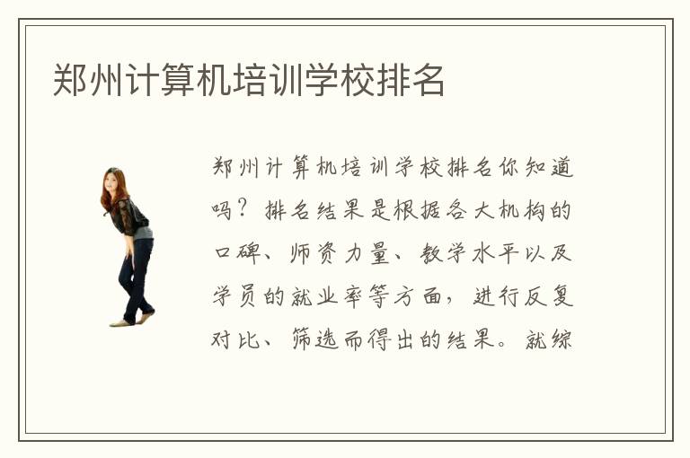 鄭州計算機培訓排名主要是學生代表、計算機界內(nèi)專家等通過多層篩選,并且經(jīng)過最終的共同敲定才得以實現(xiàn)的排名情況。鄭州計算機培訓學校相關(guān)的培訓內(nèi)容究竟有什么?鄭州計算機培訓學校培訓內(nèi)容包括有JAVA腳本設(shè)計、UI頁面設(shè)計、DW網(wǎng)頁設(shè)計等等,培訓內(nèi)容包含了多項內(nèi)容,在具有針對性的基礎(chǔ)上力求專業(yè)覆蓋能夠全面化。鄭州計算機培訓有實用性嘛?