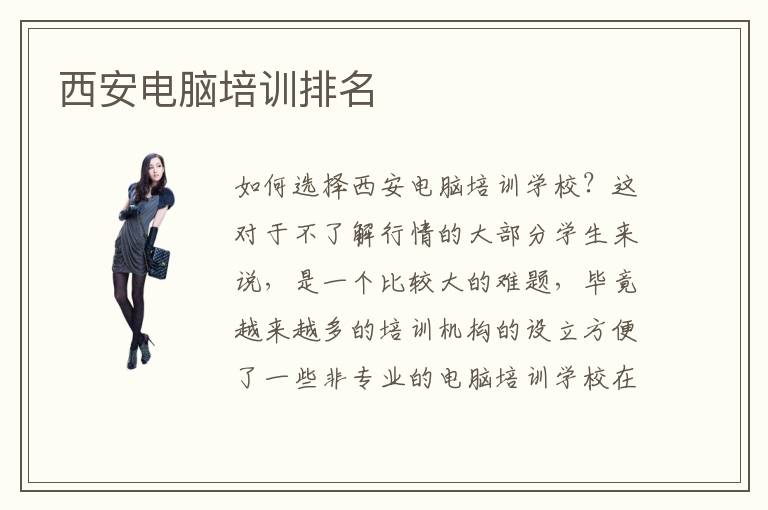 西安電腦培訓(xùn)學(xué)校排名是學(xué)生進(jìn)行培訓(xùn)學(xué)校選擇的時(shí)候的一個(gè)重要的考量點(diǎn)。西安電腦培訓(xùn)學(xué)校辦學(xué)特色是什么?西安地區(qū)電腦培訓(xùn)學(xué)校擁有專(zhuān)業(yè)的師資力量和建設(shè)人才,主要目標(biāo)是為廣大的學(xué)生營(yíng)造一個(gè)舒適的學(xué)習(xí)環(huán)境,開(kāi)辟出更廣闊的就業(yè)形勢(shì)。西安哪家電腦培訓(xùn)學(xué)校好?西安有哪幾家是性價(jià)比比較高的電腦培訓(xùn)學(xué)校?西安電腦培訓(xùn)學(xué)校哪家比較強(qiáng)?