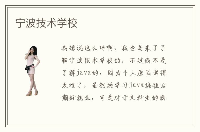我想說這么巧啊,我也是來了了解寧波技術(shù)學(xué)校的,不過我不是了解java的,因為個人原因覺得太難了,雖然說學(xué)習(xí)java編程后期好就業(yè),可是對于文科生的我,看了一下相關(guān)計算機知識,那是一個看不懂啊,或者是今天學(xué)明天忘記,如果你想了解寧波技術(shù)學(xué)校那個學(xué)校java教的好,直接去搜一下計算機學(xué)校那個好,就會出現(xiàn)很多結(jié)果的,對于排名靠前的你不妨一個個去了解一下,一般網(wǎng)上有排名的,都是有自己的官網(wǎng)的,你直接去找他們客服咨詢java課程介紹,還有就是進一些java學(xué)習(xí)的群,大家會聊一些java教的好的學(xué)校的,大專畢業(yè)當(dāng)然可以學(xué)會了,java開發(fā),java工程師這類對我來說就比較難了,羅輯思維不好,如果你是一個有耐心有縝密羅輯思維就可以去試一下,畢竟高薪待遇還是很誘惑人的