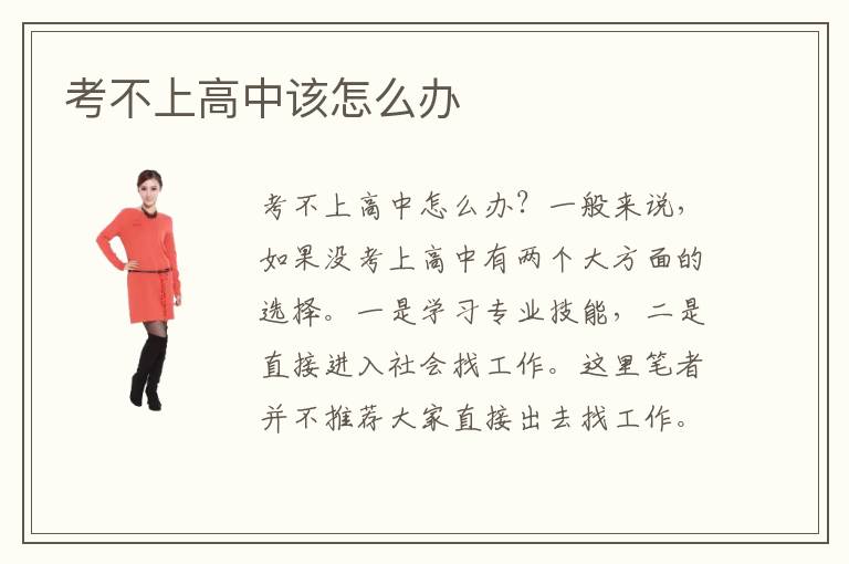 考不上高中怎么辦?一般來說,如果沒考上高中有兩個(gè)大方面的選擇。一是學(xué)習(xí)專業(yè)技能,二是直接進(jìn)入社會(huì)找工作。這里筆者并不推薦大家直接出去找工作。因?yàn)槌踔挟厴I(yè)生無論從社會(huì)經(jīng)驗(yàn)以及學(xué)歷方面,根本不具備任何優(yōu)勢(shì),可以說毫無競(jìng)爭(zhēng)力。只能從事一些簡(jiǎn)單繁重的體力勞動(dòng),收入微薄,發(fā)展空間非常小。所以趁此時(shí)要掌握一門職業(yè)技術(shù)。考不上高中還能上學(xué)嗎?答案是肯定能的。一,同學(xué)們可以選擇復(fù)讀初三,再參加中考。二、如果你是應(yīng)屆畢業(yè)生,但是不想再?gòu)?fù)讀,那么可以上職業(yè)高中,職高的招生對(duì)象正好是應(yīng)屆初中畢業(yè)生。三,上中專學(xué)校。中專學(xué)校的重點(diǎn)在于對(duì)某個(gè)職業(yè)技能的培訓(xùn),所以并不看重同學(xué)們的考試成績(jī),入學(xué)門檻低。四,上技工學(xué)校。技工學(xué)校畢業(yè)學(xué)校直接為學(xué)生頒發(fā)職業(yè)技術(shù)資格認(rèn)證書,同學(xué)們可以憑此證直接上崗工作。所以,即使考不上高中的出路還是有很多的。