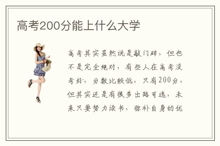 高考其實(shí)雖然說(shuō)是敲門(mén)磚,但也不是完全絕對(duì),有些人在高考沒(méi)考好,分?jǐn)?shù)比較低,只有200分,但其實(shí)還是有很多出路可選,未來(lái)只要努力讀書(shū),彌補(bǔ)自身的優(yōu)勢(shì),還是可以掌握專(zhuān)業(yè)水準(zhǔn)的。高考200分能上什么大學(xué)有哪些選擇方法,高考200分左右學(xué)校也是比較多,可以找排名比較靠后,但專(zhuān)業(yè)靠前的學(xué)校,這種水平往往競(jìng)爭(zhēng)壓力不是特別大,只要能夠報(bào)名,應(yīng)該都可以錄取。高考200分能上什么大學(xué)心情不好怎么辦,高考才200多,難免會(huì)有一點(diǎn)點(diǎn)壓抑的情緒,總是覺(jué)得自己付出了那么多,卻沒(méi)有得到與自己能力相符的成績(jī)。其實(shí)現(xiàn)在也有很多學(xué)校,就算200多分也是很容易選擇學(xué)校,既然塵埃落定,就要及時(shí)找到應(yīng)對(duì)的策略,而不是一味的嘴上是放下去。作為20歲的年輕人,當(dāng)然要有應(yīng)對(duì)挑戰(zhàn)和困難的勇氣,而不能夠只是一味的逃避。