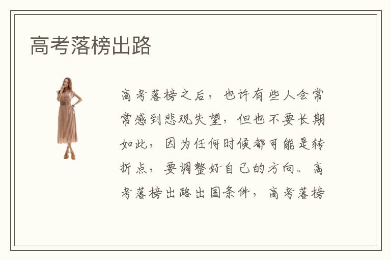 高考落榜之后,也許有些人會(huì)常常感到悲觀失望,但也不要長(zhǎng)期如此,因?yàn)槿魏螘r(shí)候都可能是轉(zhuǎn)折點(diǎn),要調(diào)整好自己的方向。高考落榜出路出國(guó)條件,高考落榜其實(shí)也是可以出國(guó)留學(xué),并不是因?yàn)橥鈬?guó)的月亮比國(guó)內(nèi)的人,而是因?yàn)閲?guó)內(nèi)的大專院校教學(xué)水準(zhǔn)確實(shí)并不如國(guó)外,如果經(jīng)濟(jì)條件允許,很多家長(zhǎng)會(huì)愿意花多一點(diǎn)費(fèi)用,讓小孩子接觸外界的環(huán)境。高考落榜出路哪些好,高考落榜之后,報(bào)考大學(xué)的時(shí)候,很有可能會(huì)吃閉門羹,大家要了解自己的定位,找到合適的學(xué)校。當(dāng)然前提是要有合適的專業(yè),有些人只是看到整體的社會(huì)發(fā)展趨勢(shì),殊不知未來(lái)畢業(yè)之后,這些發(fā)展的趨勢(shì)也可能會(huì)改變。選擇專業(yè)之前要有為結(jié)合自己的專業(yè)和興趣,這樣對(duì)自己未來(lái)的發(fā)展以及學(xué)習(xí)過(guò)程中的樂(lè)趣才會(huì)有更好的幫助。