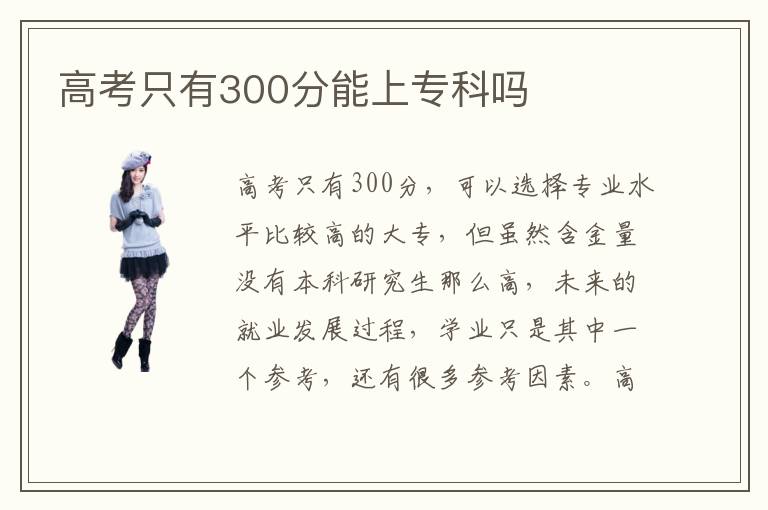 高考只有300分,可以選擇專業(yè)水平比較高的大專,但雖然含金量沒有本科研究生那么高,未來的就業(yè)發(fā)展過程,學(xué)業(yè)只是其中一個參考,還有很多參考因素。高考只有300分能上??茊岽髮:鹆吭趺礃?,大專含金量是比較低的,不可否認(rèn),也可以憑自己的實力,獲得他人的認(rèn)可。高考300分對于很多家長和學(xué)生來說,都是比較容易感到絕望和失望的,不過高學(xué)歷并不代表以后的事業(yè)一定會成功,因為現(xiàn)在雖然學(xué)歷作為一個敲門磚,但只要在同一個平臺上,相同的競爭環(huán)境下,未來的優(yōu)勢其實是有很大的變數(shù)。高考只有300分能上??茊釋I(yè)選擇,可以先了解自己擅長的領(lǐng)域以及專業(yè)的優(yōu)勢,有些人擅長電子科技,那么可以針對這些專業(yè)進行考慮,比如計算機網(wǎng)絡(luò),前端設(shè)計,軟件開發(fā)等等。一方面是社會上非常熱門,另外一方面也能為整個社會的科技進步帶來非常大的動力。