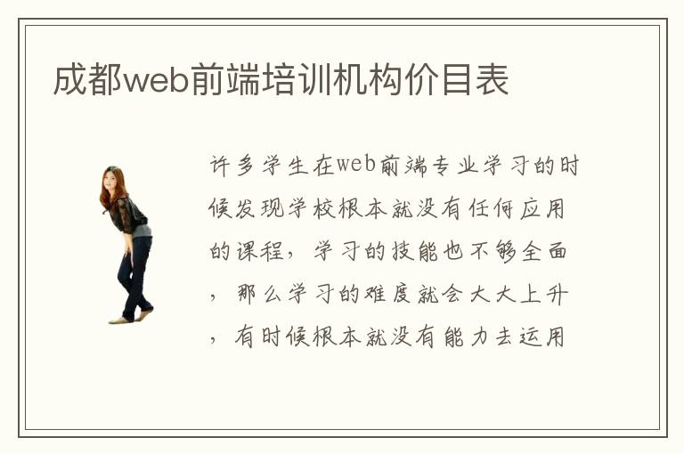 許多學(xué)生在web前端專業(yè)學(xué)習(xí)的時(shí)候發(fā)現(xiàn)學(xué)校根本就沒(méi)有任何應(yīng)用的課程,學(xué)習(xí)的技能也不夠全面,那么學(xué)習(xí)的難度就會(huì)大大上升,有時(shí)候根本就沒(méi)有能力去運(yùn)用在工作崗位中。所以大家要懂得各方面的學(xué)習(xí)方法、學(xué)習(xí)的技巧,找到專業(yè)的前端設(shè)計(jì)培訓(xùn)公司,有專業(yè)的老師來(lái)親自幫忙,制定更加符合當(dāng)代時(shí)代發(fā)展的課程內(nèi)容,也能彌補(bǔ)自己的web前端專業(yè)缺陷和漏洞。成都web前端培訓(xùn)機(jī)構(gòu)價(jià)目表,大概區(qū)間在2500元到16,000元之間,不過(guò)也要根據(jù)web前端培訓(xùn)機(jī)構(gòu)效率以及web前端培訓(xùn)機(jī)構(gòu)能力等等來(lái)判斷。要是專業(yè)的技能不算過(guò)關(guān),或者是web的應(yīng)用缺乏經(jīng)驗(yàn),由專業(yè)的培訓(xùn)班去制定相關(guān)的應(yīng)用培訓(xùn)課程,而且也更加符合學(xué)生的需求,以后會(huì)有非常好的競(jìng)爭(zhēng)價(jià)值。