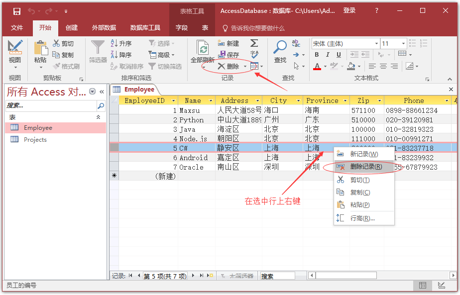 現(xiàn)在可以看到,在數(shù)據(jù)表視圖中插入新數(shù)據(jù)和更新現(xiàn)有數(shù)據(jù)在電子表格中非常簡(jiǎn)單。但是如果想刪除任何數(shù)據(jù),例如要?jiǎng)h除EmployeeID為5的那一行數(shù)據(jù),需要首先選擇整行,右鍵選擇:刪除記錄或點(diǎn)擊菜單:刪除,如下圖所示。