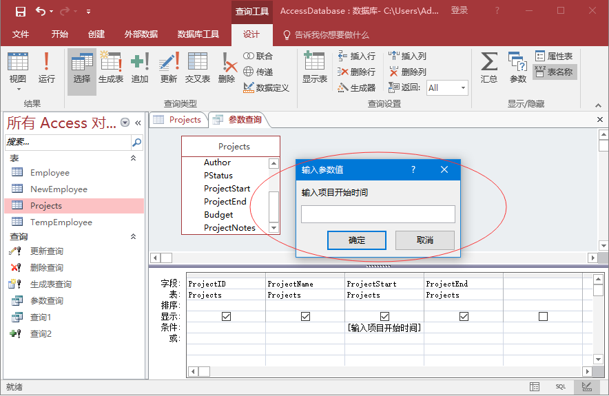 在查詢設(shè)計(jì)網(wǎng)格中,在ProjectStart列的條件 行中,鍵入[輸入項(xiàng)目開始時(shí)間], 字符串[輸入項(xiàng)目開始時(shí)間] 是輸入?yún)?shù)的提示。方括號(hào)表示要查詢輸入,而文本是輸入項(xiàng)目開始時(shí)間是參數(shù)提示信息。