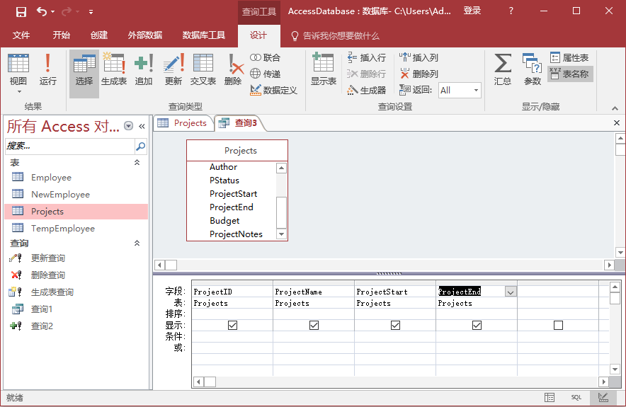 現(xiàn)在通過創(chuàng)建一個(gè)簡單的例子來看看一個(gè)參數(shù)查詢。打開數(shù)據(jù)庫,然后在創(chuàng)建表 選項(xiàng)卡中選擇:查詢設(shè)計(jì)。雙擊Projects表并關(guān)閉顯示對話框。