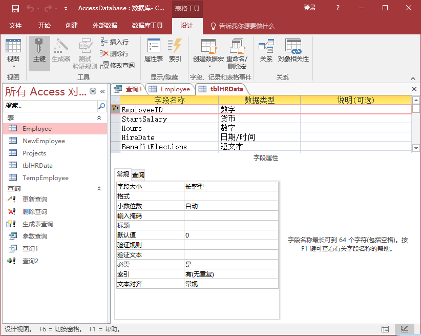 表設(shè)計(jì) 將其命名為:tblHRData ,如以下屏幕截圖所示。