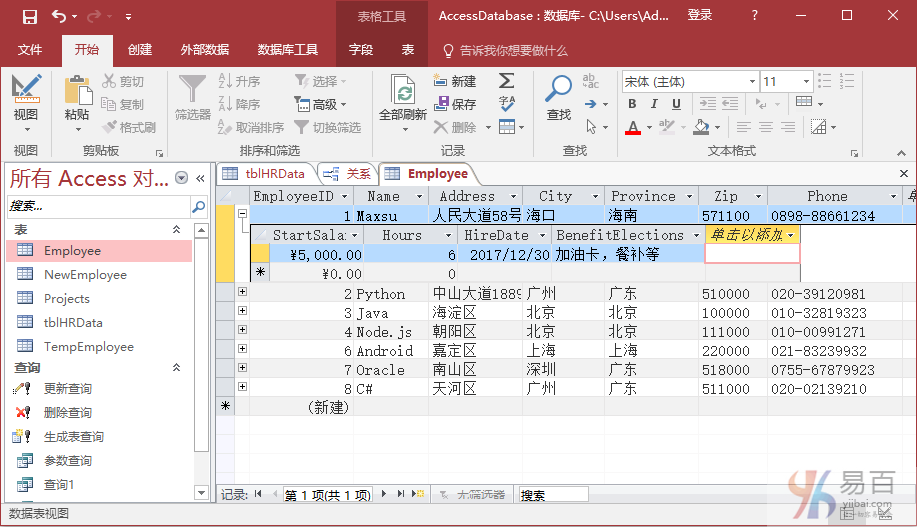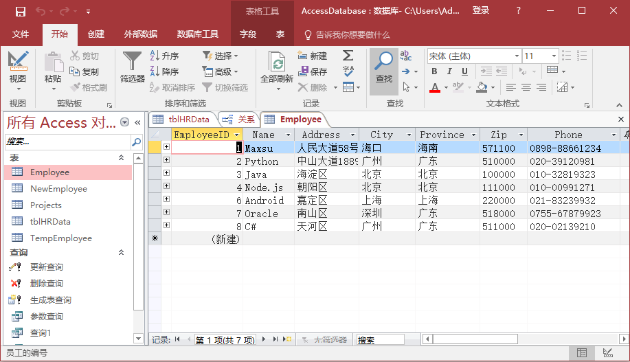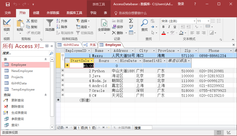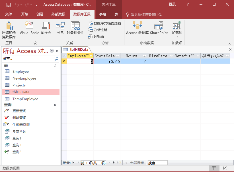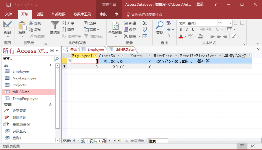 點(diǎn)擊保存圖標(biāo)并打開(kāi)tblHRData,會(huì)看到前面已經(jīng)輸入的數(shù)據(jù)顯示出來(lái)。