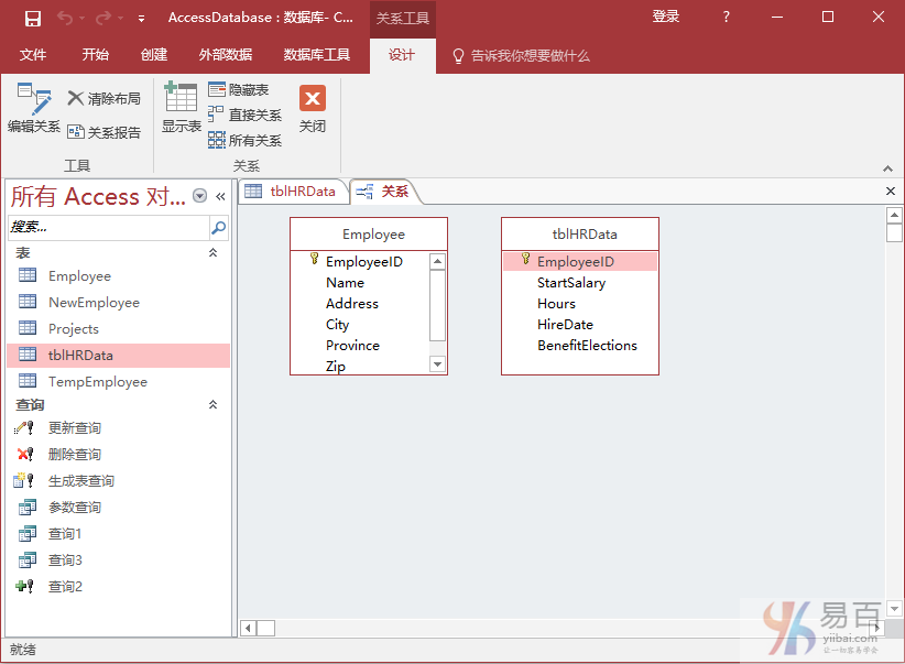 以上窗口將Employees的EmployeeID字段與tblHRData的EmployeeID關(guān)聯(lián)起來(lái)。 現(xiàn)在點(diǎn)擊 創(chuàng)建 按鈕,現(xiàn)在這兩個(gè)表就創(chuàng)建了相關(guān)聯(lián)關(guān)系了。如下圖所示 -