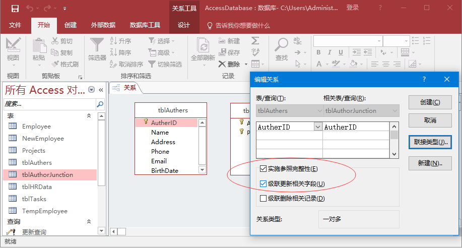 我們將強化參照完整性和級聯(lián)更新相關(guān)字段。如下圖所示 -