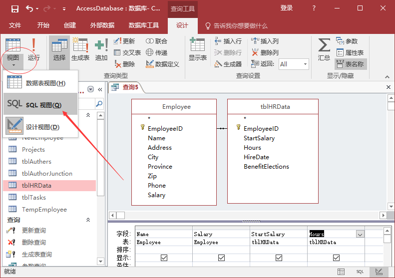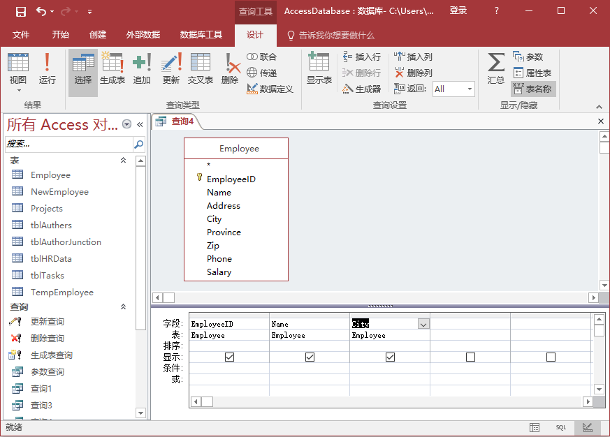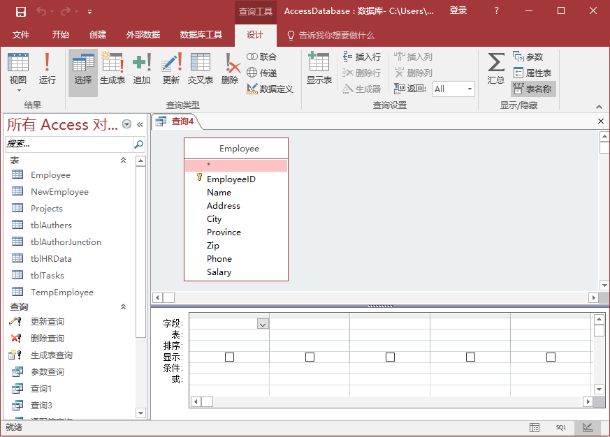 現(xiàn)在可以查看查詢結(jié)果的所有員工信息,在查詢網(wǎng)格中選擇了某些字段; 與此同時(shí),MS Access也創(chuàng)建了一個(gè)SQL查詢,查詢網(wǎng)格獲得的結(jié)果。