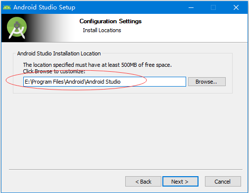 第3步: 選擇安裝的路徑(這里為:E:\Program Files\Android\Android Studio),如下所示 -
