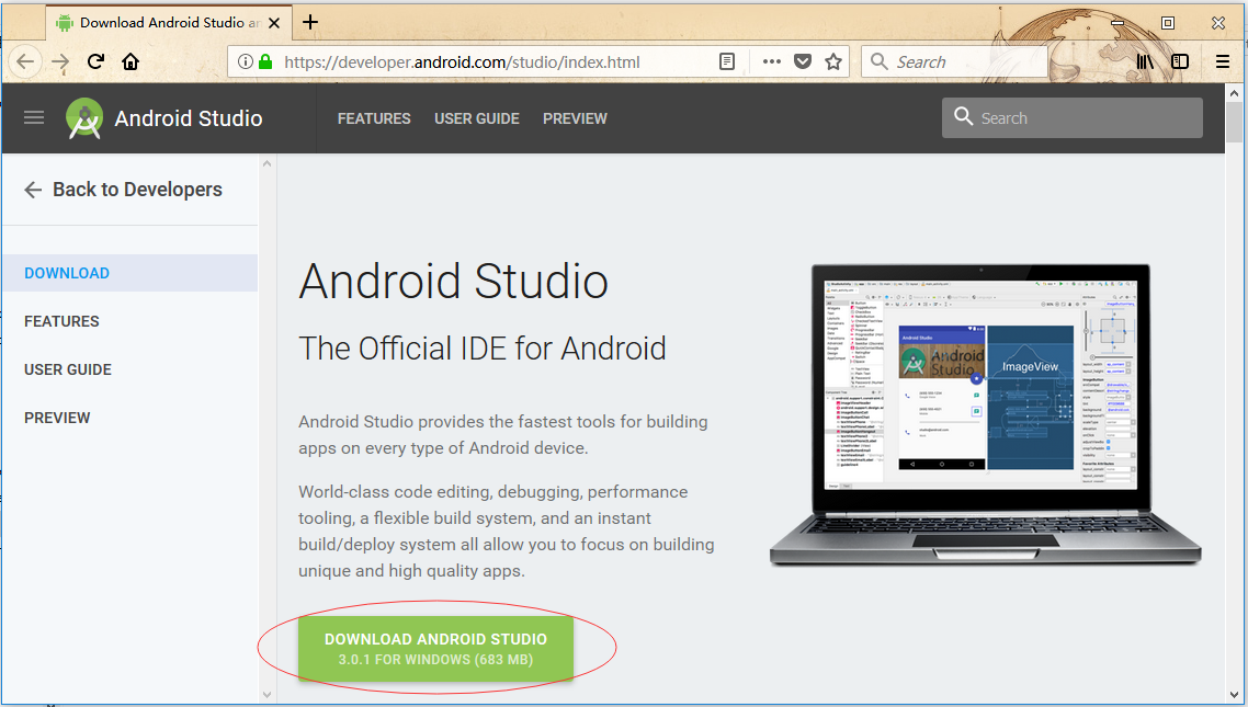 Android Studio是Android應(yīng)用程序開(kāi)發(fā)的官方IDE。它基于IntelliJ IDEA,可以下載最新版本的Android Studio(當(dāng)前最新版本是:Android Studio 3.0.1)。官方下載的頁(yè)面如下所示 -