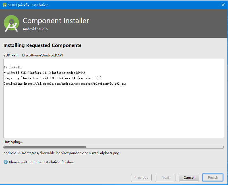 注意:在這個(gè)過程中,Android Studio 可能需要安裝一些其它的依懶組件,這就要求必須能連接到互聯(lián)網(wǎng)絡(luò)了。安裝過程如下 -
