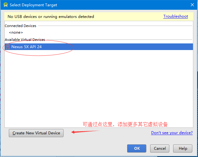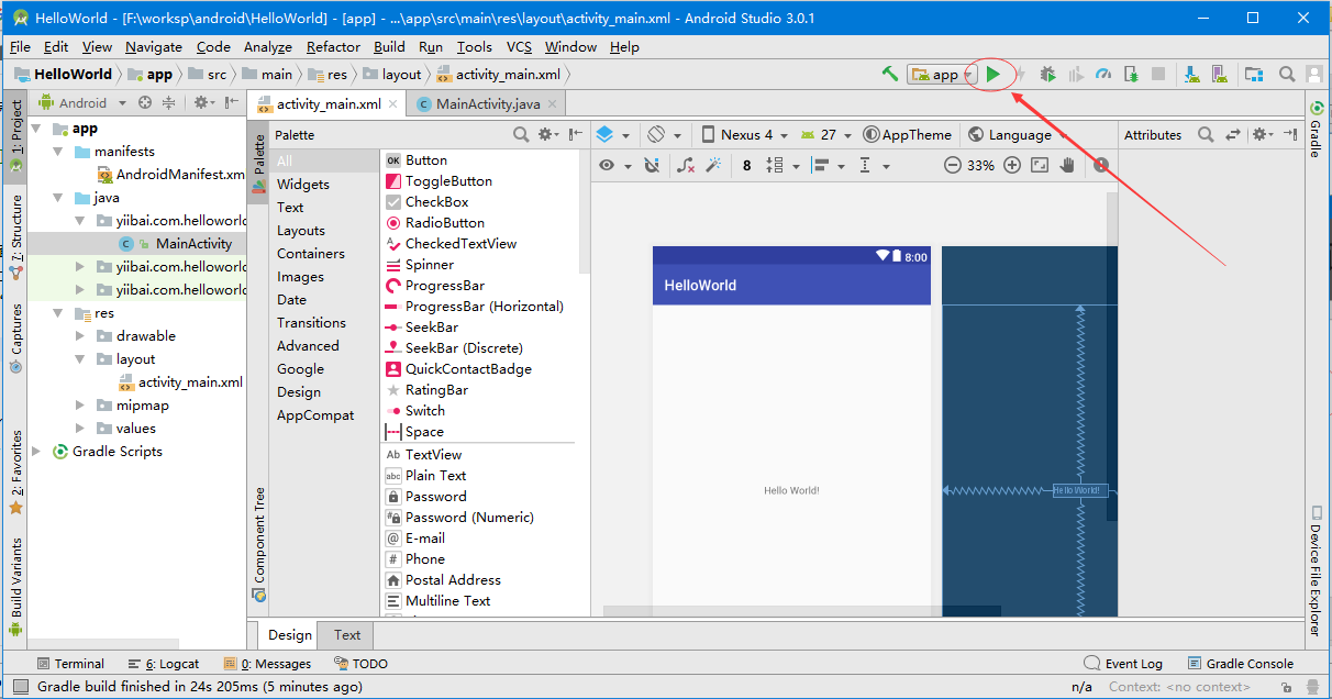 下面來看看,如何運(yùn)行這個(gè)"Hello World!" 應(yīng)用程序。假設(shè)您在創(chuàng)建環(huán)境的時(shí)候創(chuàng)建了AVD。 要從Android Studio運(yùn)行應(yīng)用程序,請(qǐng)打開項(xiàng)目的一個(gè)活動(dòng)文件,然后單擊工具欄上的“運(yùn)行app”圖標(biāo)。如下圖中箭頭指向的位置 -