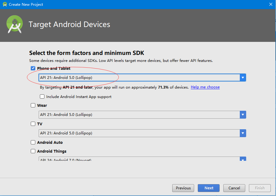輸入應(yīng)用程序名稱(HelloWorld)后,選擇應(yīng)用程序運(yùn)行的Android目標(biāo)設(shè)備,在這里需要指定最小的SDK,在這個(gè)教程中,選擇最小SDK為 API 21:Android 5.0(Lollipop) -