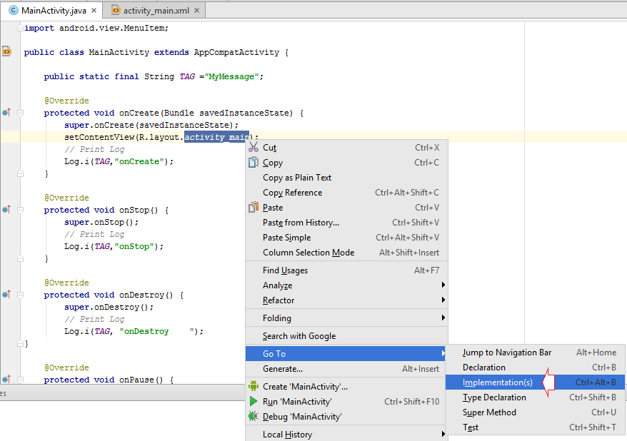 要在Android Studio上查看R.java 文件,請(qǐng)打開MainActivity類,右鍵單擊R.layout.main_activity,然后選擇執(zhí)行(Go to / Implementation)