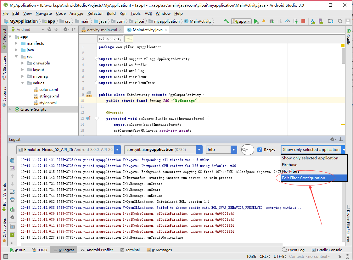 可以將篩選器設(shè)置為logcat,只顯示日志記錄的消息。