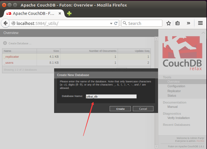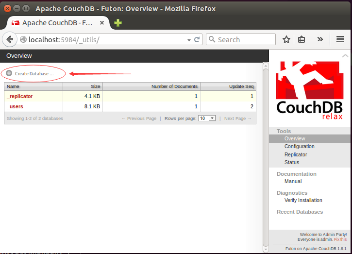 在CouchDB中,數(shù)據(jù)庫(kù)是存儲(chǔ)文檔的最外層結(jié)構(gòu)。 CouchDB提供cURL實(shí)用程序來(lái)創(chuàng)建數(shù)據(jù)庫(kù)。 您也可以使用Futon的CouchDB Web界面。