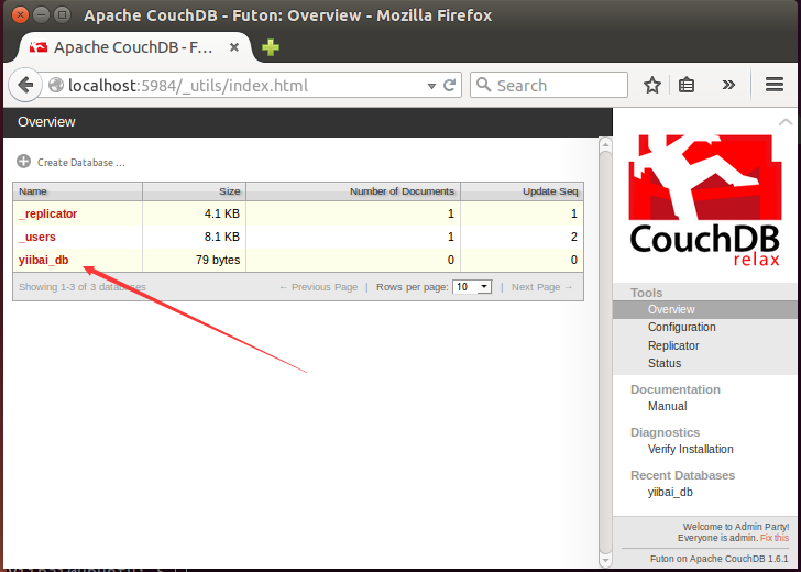 yiibai@ubuntu:~$ curl -X GET http://localhost:5984/_all_dbs