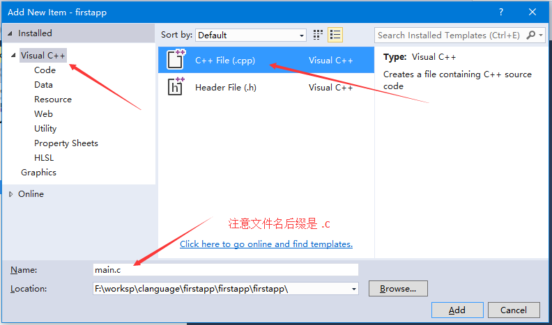 步驟5 - 選擇文件類型:Visual C++ -> C++ File(.cpp),然后點(diǎn)擊Add完成,如下所示 -