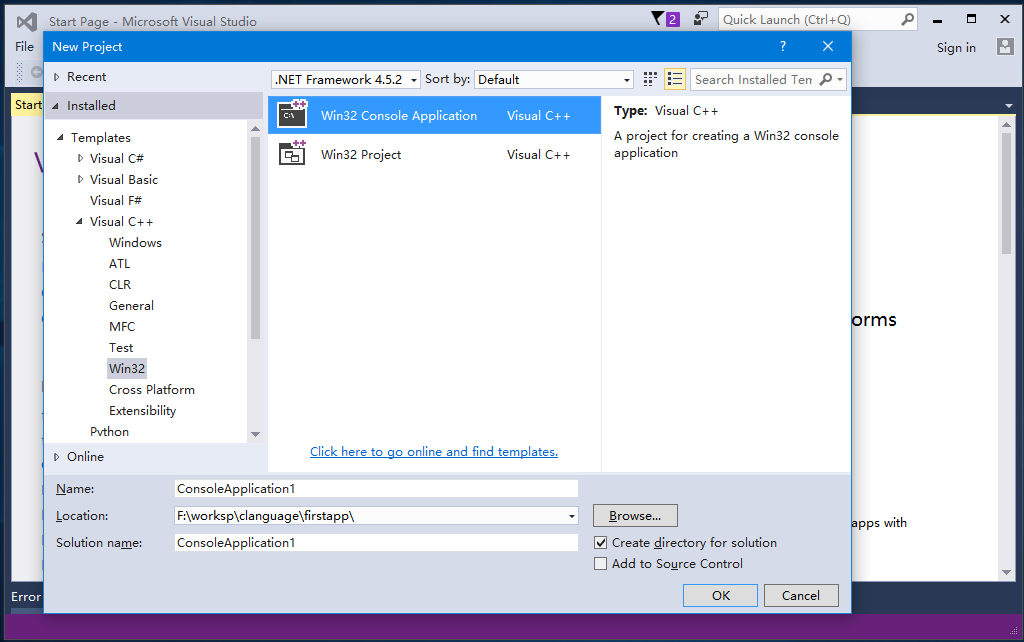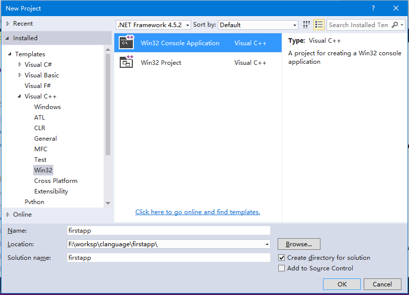 步驟2 - 在右側(cè)選擇項(xiàng)目類型:Win32 -> Win32Console Application Visual C++ ,并填空項(xiàng)目名稱為:firstapp,選擇存儲(chǔ)位置為:F:\worksp\clanguage\firstapp\firstapp , 如下所示 -