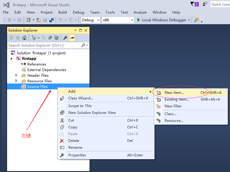 現(xiàn)在,打開Solution Explorer(打不到可從主菜單:View中找到打開),在firstapp項(xiàng)目下,右鍵Sourec Files->Add->New Item…,并創(chuàng)建一個(gè)源代碼文件:main.c 如下所示 -
