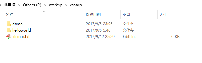 可以在F:\worksp\csharp目錄內(nèi)看到有一個(gè)文件:fileinfo.txt被創(chuàng)建。如下圖中所示 -