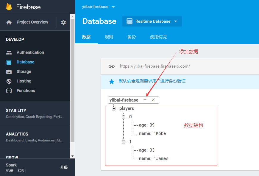 Firebase數(shù)據(jù)是JSON對(duì)象格式的數(shù)據(jù)。 如果從Firebase信息中心打開應(yīng)用,則可以通過單擊+號(hào)手動(dòng)添加數(shù)據(jù)。