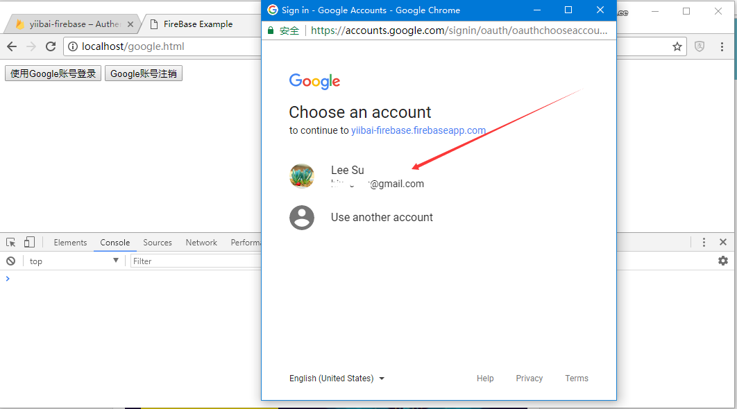 刷新頁(yè)面后,可以點(diǎn)擊使用Google賬號(hào)登錄按鈕觸發(fā)Google彈出窗口。 如果登錄成功,開(kāi)發(fā)者控制臺(tái)將登錄指定的用戶賬號(hào)。