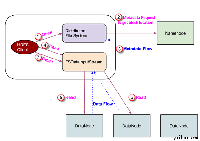 數(shù)據(jù)讀取請求將由 HDFS,NameNode和DataNode來服務(wù)。讓我們把讀取器叫 “客戶”。下圖描繪了文件的讀取操作在 Hadoop 中。